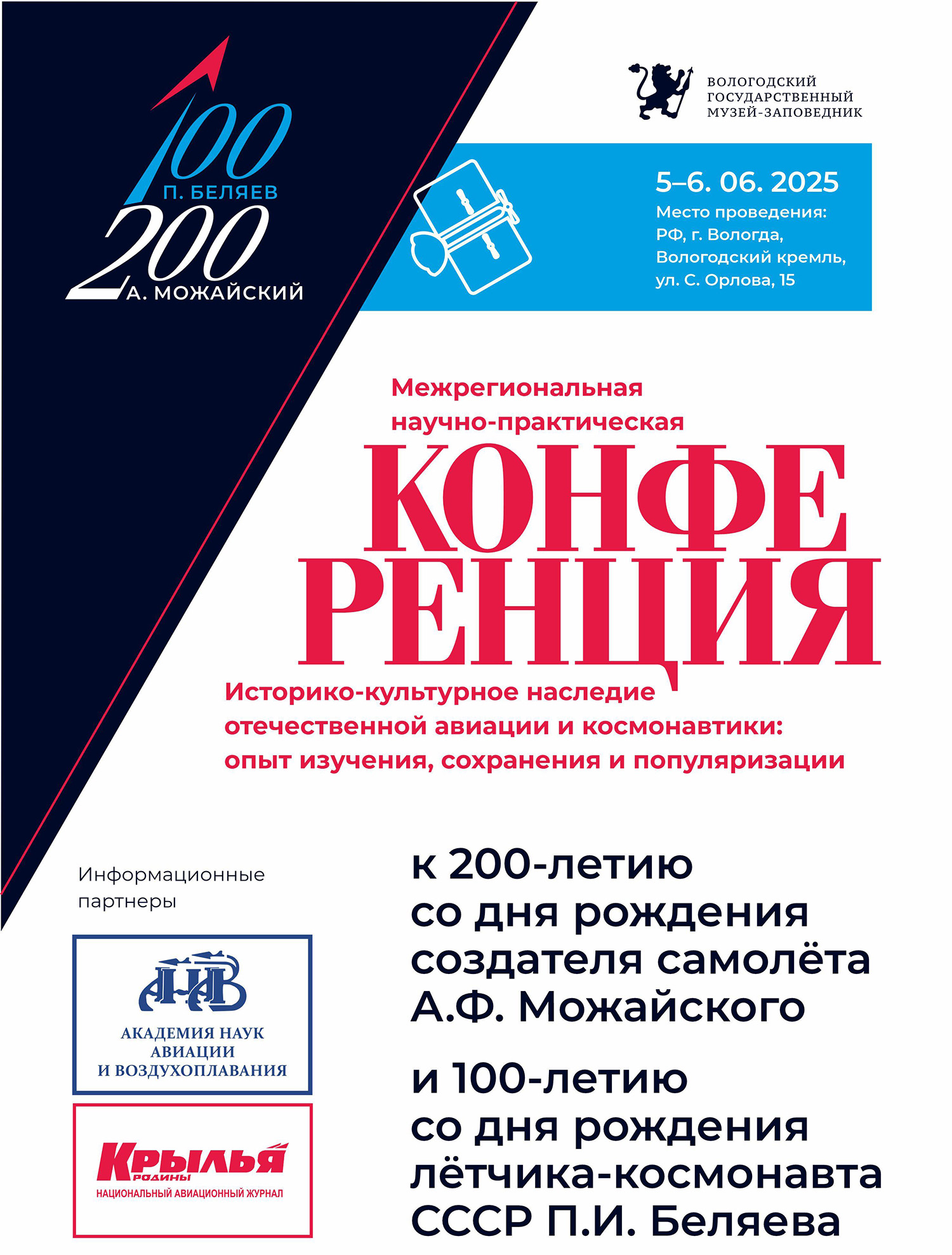 Она состоялась в Вологде в июне 2025 года и собрала более 30 участников – исследователей, учёных, преподавателей, журналистов, учащихся, специалистов музеев и архивов из разных регионов страны, которые представили свои доклады, посвященные истории и развитию воздухоплавания, авиации и космонавтики, а также жизни и деятельности военного инженера и конструктора Александра Можайского, лётчика-космонавта Павла Беляева и других выдающихся авиаторов поколения.